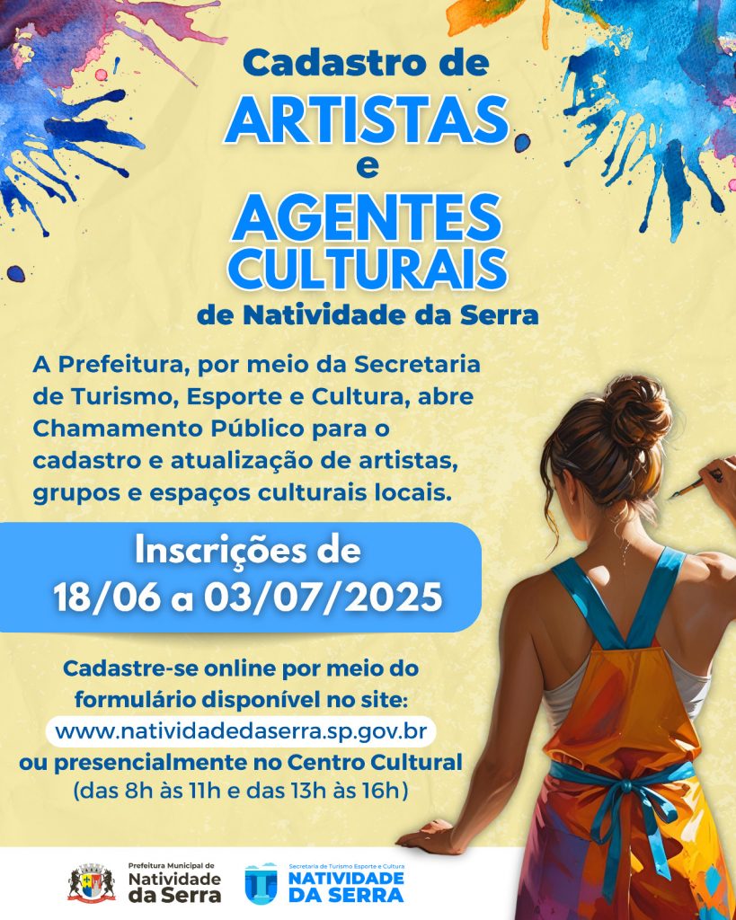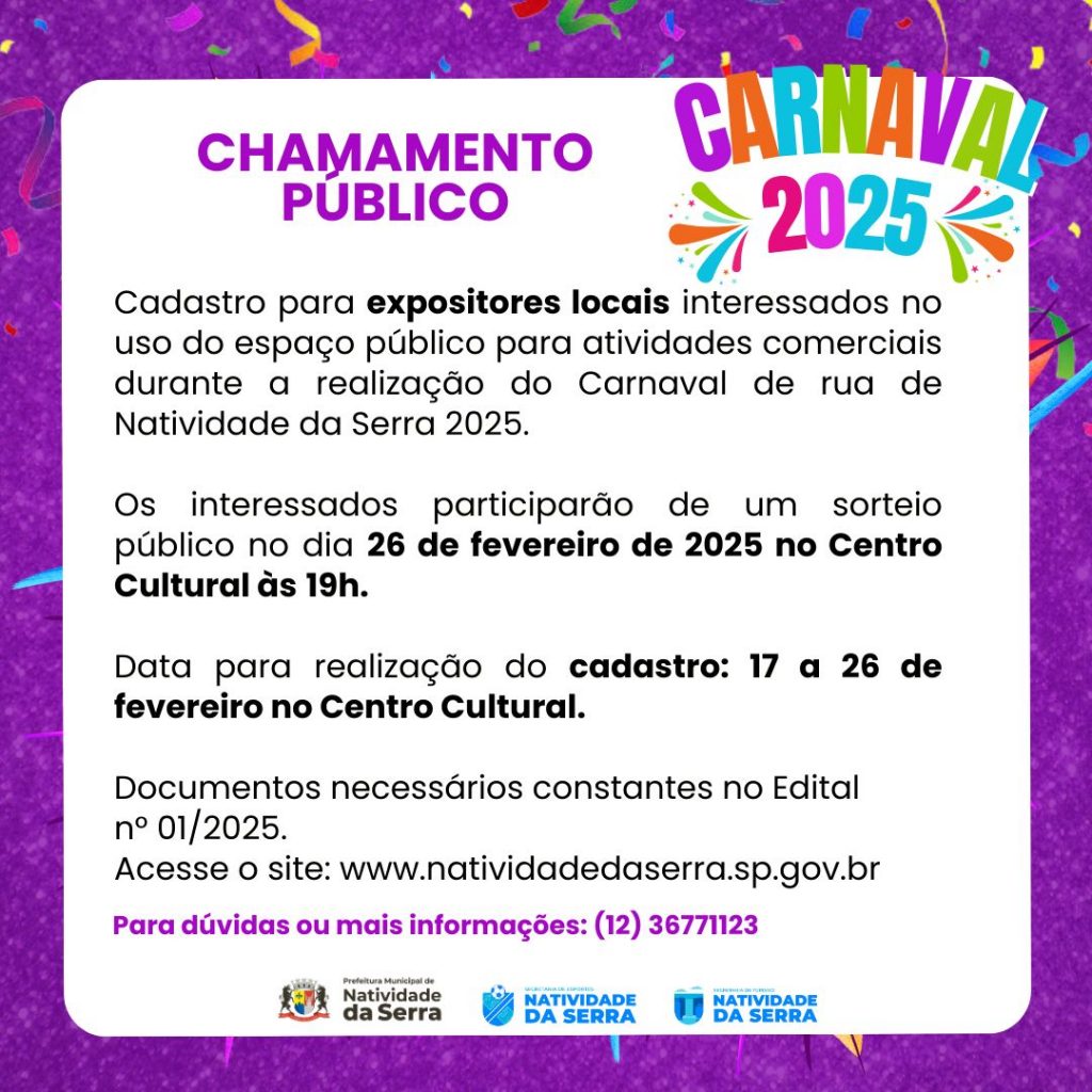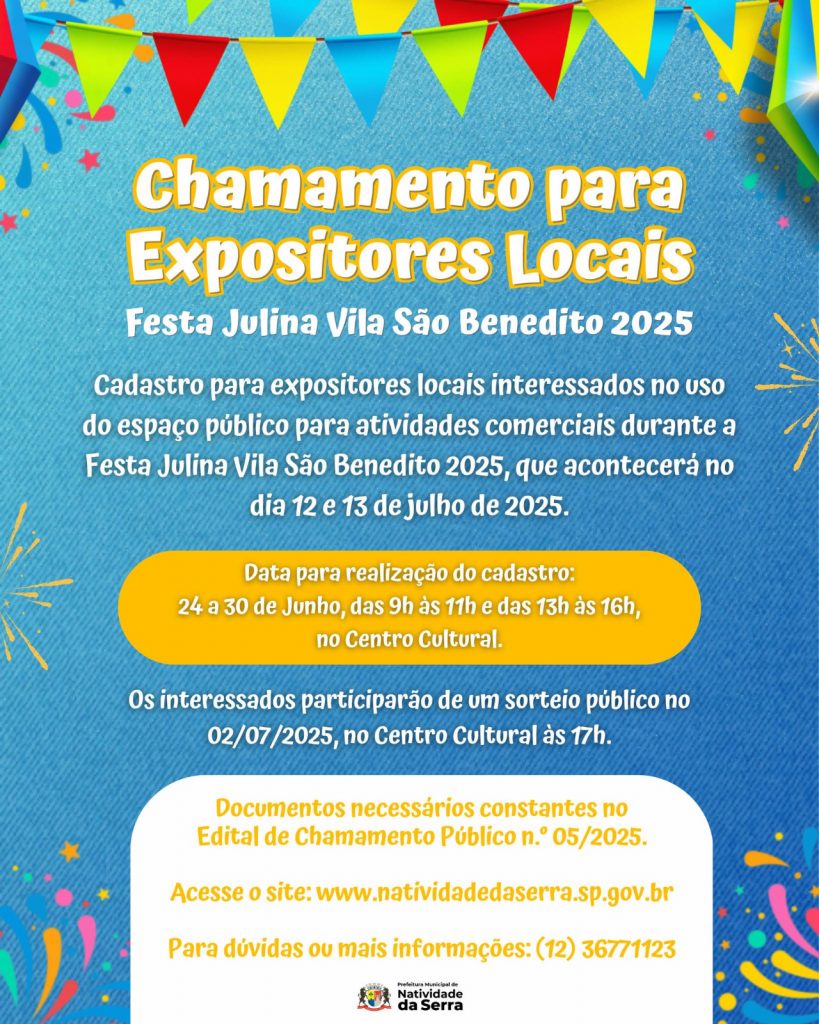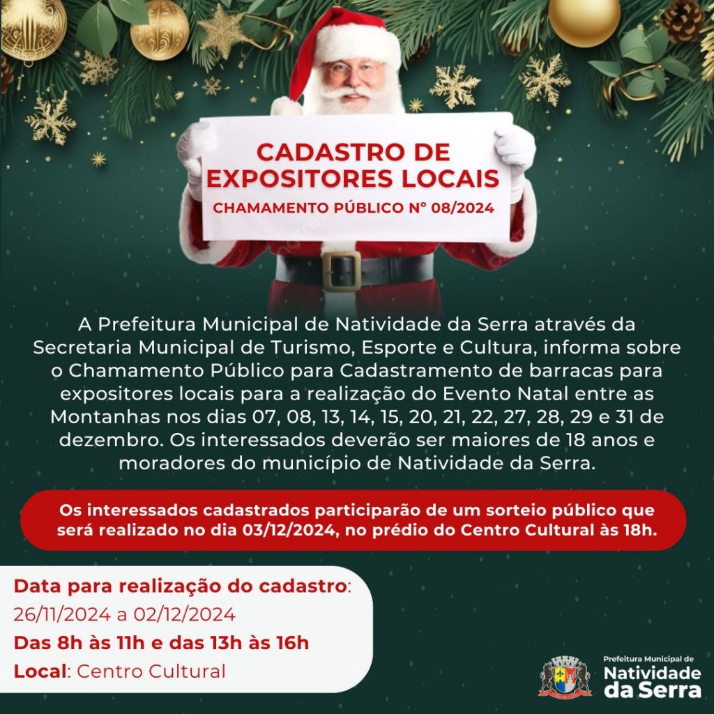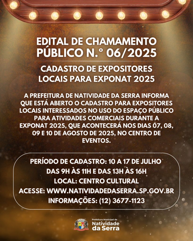 A PREFEITURA MUNICIPAL DE NATIVIDADE DA SERRA – SP, através da Secretaria Municipal de Turismo, Esporte e Cultura e em conformidade à Lei Municipal nº 1.018, de 22 de junho de 2023, torna público o presente Edital para informar o CADASTRO DE EXPOSITORES LOCAIS eventualmente interessados no uso de espaço público para atividades comerciais durante a realização da 29ª EXPONAT – Exposição […]