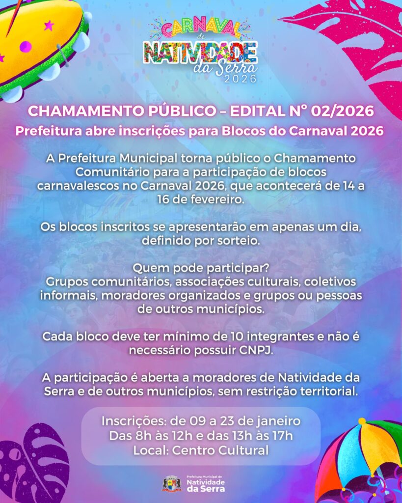 A Prefeitura Municipal de Natividade da Serra, por meio da Secretaria Municipal de Turismo, Esporte e Cultura, informa que foram realizadas adequações no Edital de Chamamento Público nº 003/2026, visando melhor organização do Carnaval 2026. Permanecem válidas as demais disposições não alteradas. Veja a retificação do edital abaixo: Mais informações no Centro Cultural, pelo telefone […]
