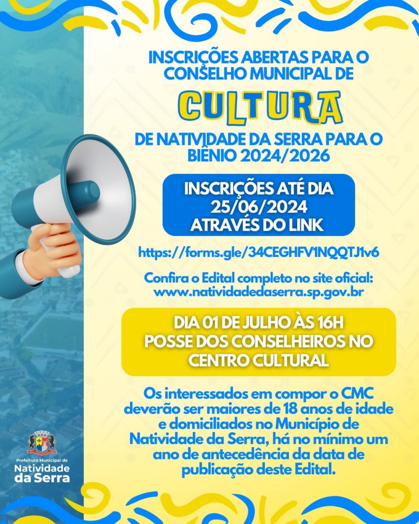 Maiores informações: (12) 3677-1123 ou pelo email: cultura@natividadedaserra.sp.gov.br https://www.natividadedaserra.sp.gov.br/edital-n-o-003-2024-abertura-de-inscricoes-conselho-municipal-decultura