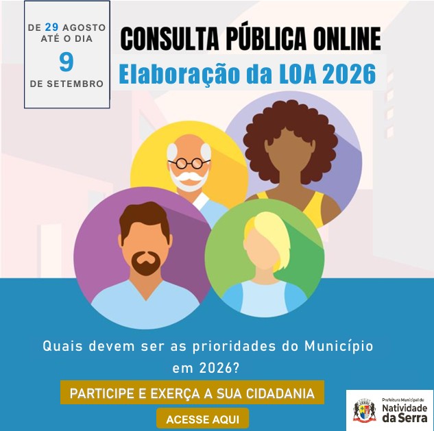 A Prefeitura Municipal de Natividade da Serra CONVOCA os senhores Secretários e Servidores Municipais, Representantes das Entidades de Classes e Religiosas, Conselhos Municipais, Câmara Municipal e os demais segmentos da comunidade do Município de Natividade da Serra, a participarem da elaboração da Lei Orçamentária Anual (LOA) para o exercício de 2026. Os projetos, ações e