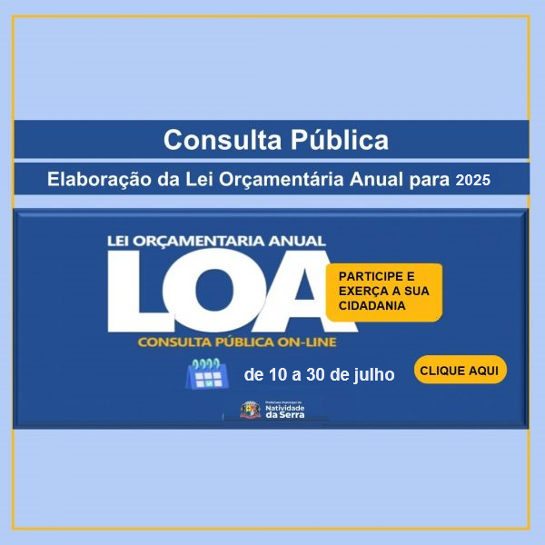A partir desta terça-feira (dia 1º) e até o dia 16 de agosto, a Prefeitura de Natividade da Serra disponibilizará o formulário de participação da população na elaboração da Lei Orçamentária Anual – LOA 2024. Para participar, basta acessar o link clicando aqui. O que é a LOA (Lei Orçamentária Anual)Elaborada pelo Executivo e aprovada