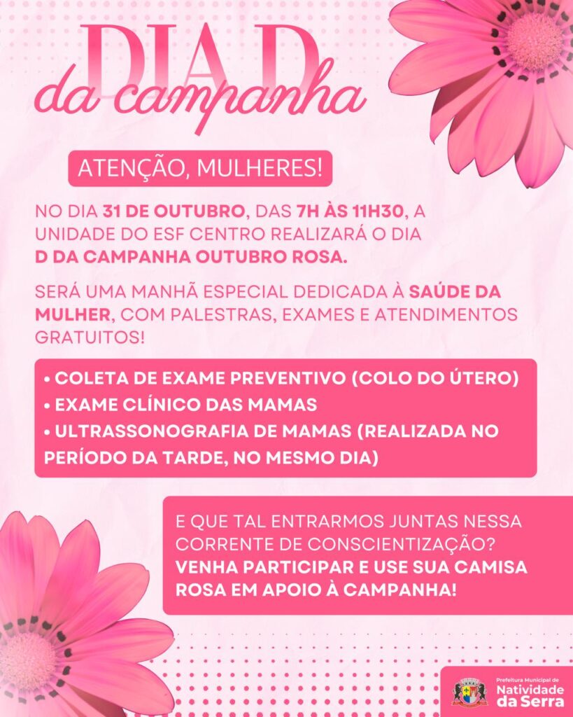 A Prefeitura Municipal de Natividade da Serra, por meio da Secretaria de Saúde, convida todas as mulheres para participarem do Dia D da Campanha Outubro Rosa, que será realizado no dia 31 de outubro, das 7h às 11h30, na unidade do ESF Centro.
